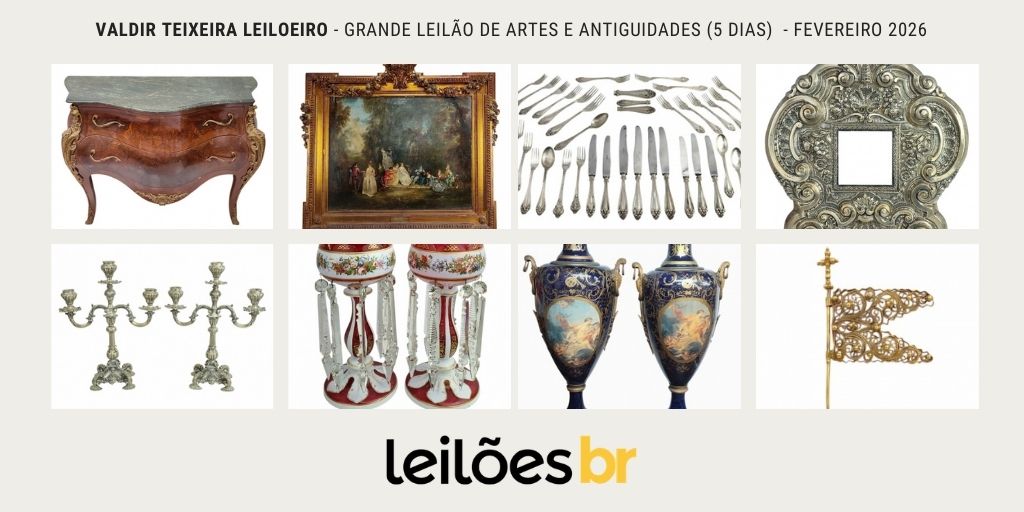 O Valdir Teixeira Leiloeiro realizará nos dias 23, 24, 25, 26 e 27 de Fevereiro, às 15h, o seu tradicional Grande Leilão de Arte e Antiguidades (5 Dias), com um total de 1151 lotes com esculturas, antiguidades, prataria, porcelana, joias, decoração e muito mais. Confira alguns destaques que separamos especialmente para vocês, clique nas imagens para […]