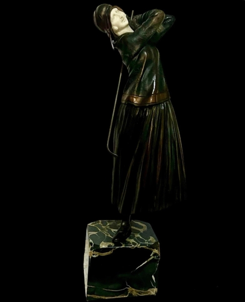 Chiparus, Demetre, The Golfer, escultura de bronze e marfim sobre base de mármore portoro. 40 cm. Assinada na base. Reproduzida no livro Master of Deco, Albert Shayo, figura 2, página 70. Reproduzida também no livro Bryan Catley, Art Deco and Other Figures, pág 82.<br>