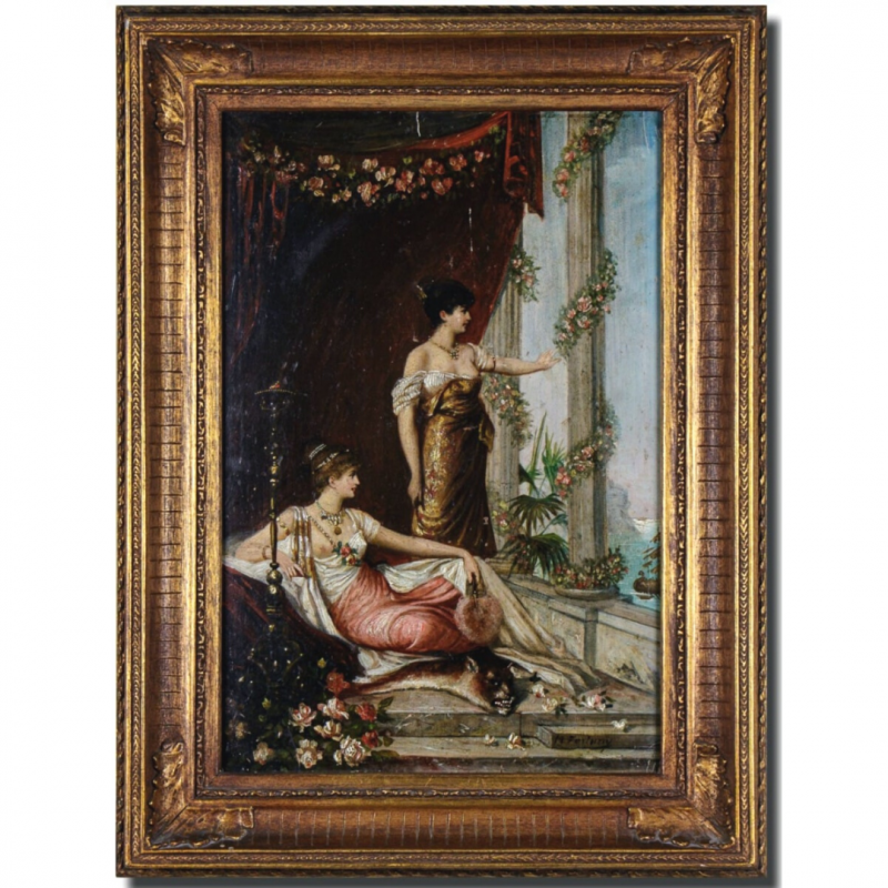 MARIANO FORTUNY Y CARBO (REUS,ESPANHA 1838 – 1874 ROMA,ITÁLIA) – Preciosa e belíssima pintura executada finamente em óleo sobre placa de madeira, ricos detalhes e movimentos com cores vibrantes. Assinado no C.I.D. medindo 26 x 39 cm. Enquadrada em moldura de época em madeira nobre trabalhada medindo 38,5 x 51,5 cm. Bom estado de conservação.