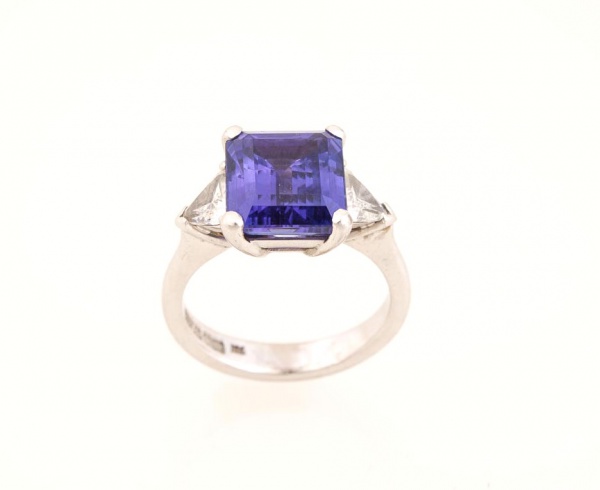 Espetacular e belíssimo anel em ouro branco 750 contrastado com excepcional tanzanita de 4.98 ct, saturation Vivid, claridade Eye Clen, lateral com dois brilhantes triangulares de aproximadamente 0,29 ct cada. Aro 15. Peso total: 6,7g. Acompanha certificado da Fundação Tanzanita da África do Sul.