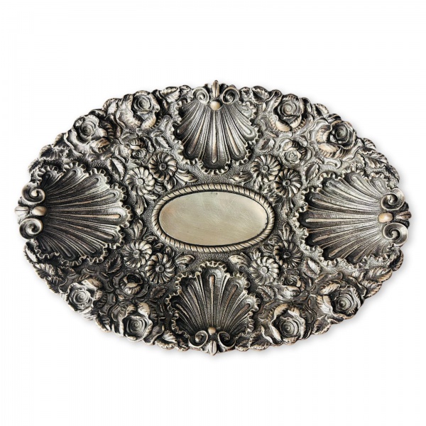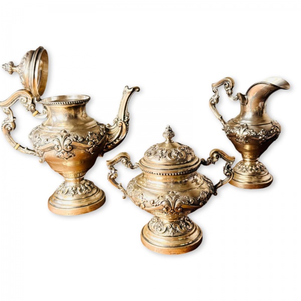 clique aqui para ver o lotePrata de lei Portuguesa – Conjunto composto para café em prata de lei portuguesa estilo Dom João, cinzelado e repuxado com plumas volutas e florões. Bordas onduladas, bico de cabeça de pato. Puxador em pinha. Composto de bule, leiteira e açucareiro. Final do século XIX. Bule: 27 x 25 x 15 (905 g)Açucareiro: 18 x 19 x 13 (520 g) Leiteira: 20,5 x 15,5 x 10,5 (405g)Peso Total: 1830 g
