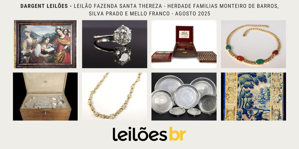 A D’argent Leilões realizará nos dias 18 a 22 de Agosto, às 19:30, o Leilão Fazenda Santa Thereza – HERDADE FAMILIAS MONTEIRO DE BARROS, SILVA PRADO E MELLO FRANCO. Confira alguns destaques que separamos especialmente para vocês, clique nas imagens para ir diretamente a peça. EXPOSIÇÃO Dias 14 a 17 de agosto de 2025 das […]