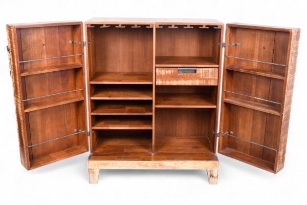 Armário em madeira rústica com ferragens em metal aparente, portas frontais de abrir e acabamento patinado, medindo 110 cm de altura, 90 cm de largura e 45 cm de profundidade, em bom estado de conservação.