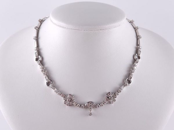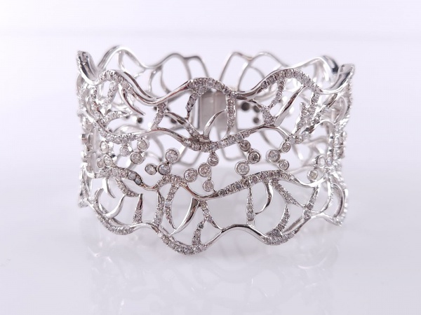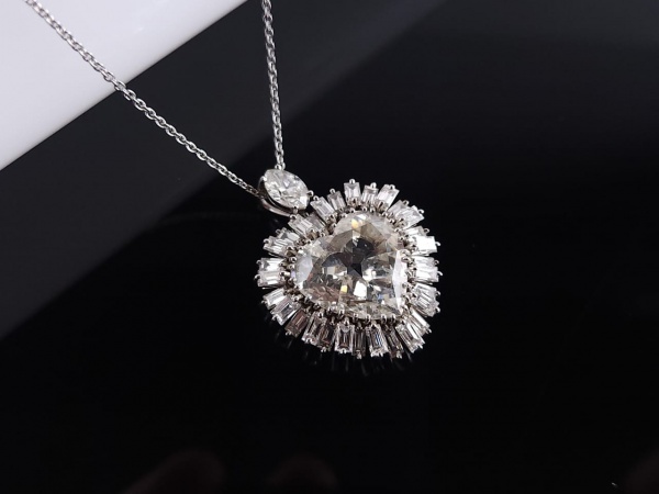 clique aqui para ver o loteMagnífico Pingente em Ouro Branco 18k cravejado com diamante central de 5.20 cts, lapidação HEART ( Coração ), classificação J – Si, cercado com 30 diamantes lapidação baguete, aproximadamente 2 cts, apresenta também 1 diamante lapidação navete em sua base, aproximadamente.