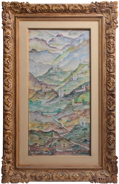 clique aqui para ver o loteGUIGNARD, Alberto da Veiga – Paisagem de Ouro Preto. Óleo sobre madeira, assinado no canto inferior direito e no verso. Década de 50. Medidas: 100 x 53 cm (sem moldura), 1,38 x 58 cm (com moldura). Obs.: Obra pertenceu a coleção de Aroldo Gomes de Mattos.