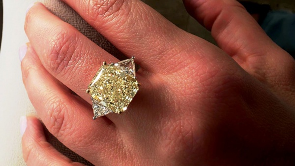 clique aqui para ver o loteAnel com diamante central S2 Fancy light, 7,67ct e par de diamantes triângulos cor G 1,48cts. Aro 17. (Esse lote poderá ser pago em 12x no cartão sem juros).