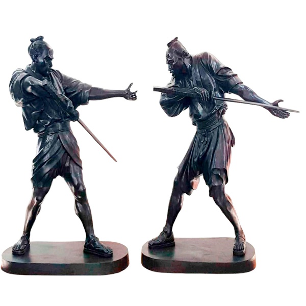 clique aqui para ver o loteRaro e magnífico par de grandes esculturas de bronze patinado de excepcional fundição, na figura de Samurais e suas espadas, vestes decoradas com motivos orientais típicos. Base também de bronze. 115 x 100 x 180 cm altura e 140 x 63 x 170 cm altura. (Esse lote encontra-se em São Paulo, o frete é por conta do arrematante).