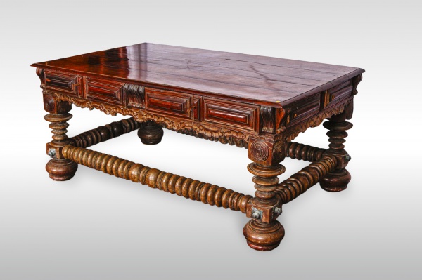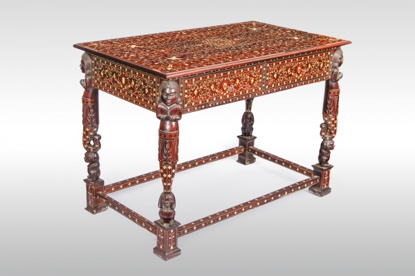 clique aqui para ver o loteMesa indo-portuguesa em madeira marchetada com marfim. Goa, por volta de 1700. A caixa repousa sobre quatro pernas com amarração em quadro, as travessas torneadas. Pernas com figuras à guisa de cariátides. Acima as de maior altura e abaixo as de menor. Tais figuras expressam realizações da estatuaria profana da Índia do período de sua fatura. Altura: 0. 82 m. Largura: 0. 665 m. Comprimento: 1. 155 m.