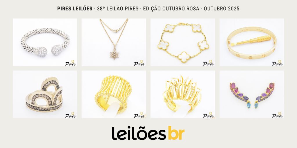 Pires Leilões fará nos dias 20 e 21 de Outubro, às 19h, o seu incrível 38° Leilão de Joias de Luxo. São 301 lotes variados, com excelentes oportunidades em joias, pratas, ouro, entre outros artigos de luxo! Separamos abaixo alguns dos destaques, clique nas imagens para ir diretamente a peça. De 10 de Outubro à […]