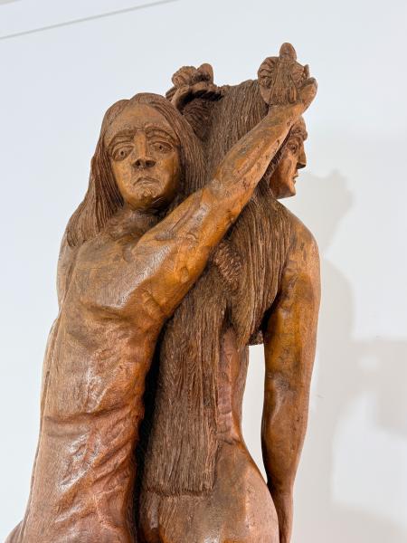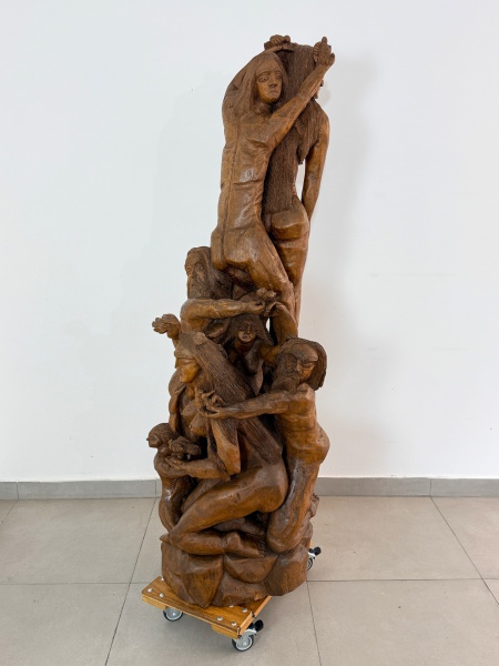 clique aqui para ver o loteCarlos. Grande grupo escultórico em madeira, entalhado à mão em único bloco de madeira, com diversos personagens. Assinado e datado na base. Arte popular brasileira. Medindo : 190 x 65 x 50 cm