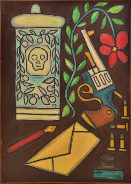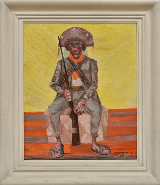 PORTINARI, CÂNDIDO (1903-1962). “Cangaceiro”, 65 X 52, óleo s/ tela. Assinado e datado (1959) no c.i.d. Esta obra encontra-se reproduzida no “Catálogo Raisonné” do artista na pág. 415, figura 4504. Acompanha documento com o número do registro no “Projeto Portinari”