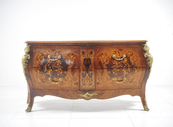 ANTIGUIDADE | Extraordinária cômoda Francesa bombê, toda executada em madeira nobre com riquíssimo trabalho de marqueterie, destaque para par de esculturas feitos de bronze, finamente incrustados nas laterais frontais, contem 4 gavetões com guarnições em bronze dourado e pés curvos.