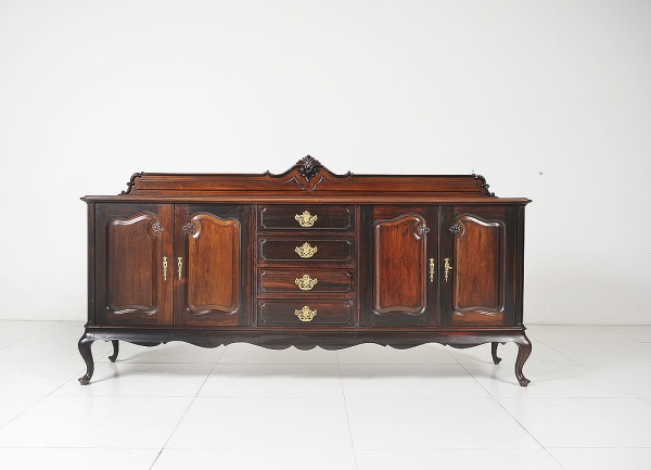 ANTIGUIDADE | Espetacular buffet executado em jacarandá maciço e folhas no estilo Chippendale, possui caixa retangular, tampo com borda recortada, frente ondulada dispondo de 4 gavetas, 4 portas laterais com molduras e entalhes, puxadores em metal dourado e saia recotada| Med.: Alt. 124 x Comp. 236 x Larg. 60 cm
