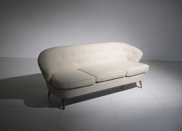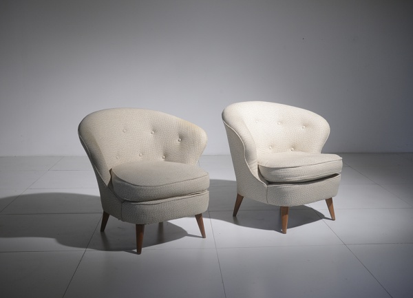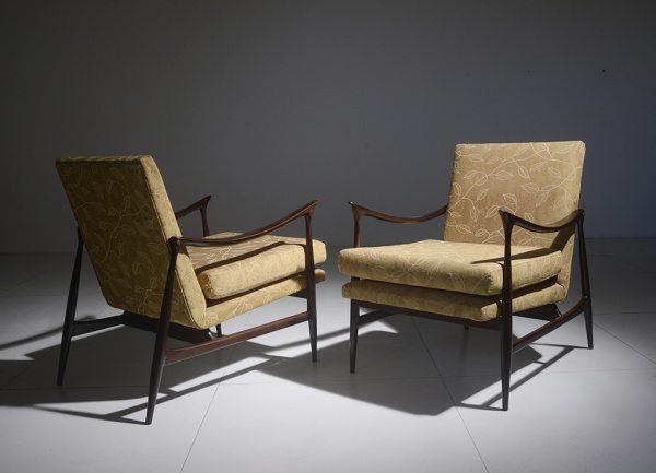 Joaquim Tenreiro – Brasil, c. 1960 | Extraordinário e raríssimo par de poltronas concha com estrutura executada em madeira nobre e estofamento revestido em tecido marfim capitonê. lote em excelente estado | Med.: Alt. 77 cm x Larg. 82 cm x Prof. 74 cm.