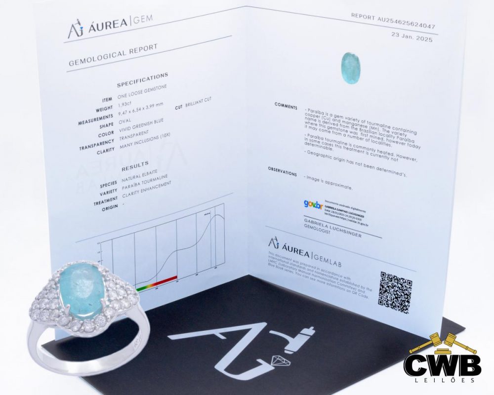 clique aqui para ver o loteAnel Sofisticado em Ouro Branco 18K com Turmalina Paraíba de 1,93 Cts 9,47 x 6,54 x 3,99 mm (Acompanha Certificado ÁUREA GEMLAB) e 63 Pontos de Diamantes, Lapidação: Brilhante, Cor: IJ e Pureza: VVSI,17 Aro 18,5, peso de 5,2 gramas. Acompanha certificado de garantia CWB LEILÕES. (OBS: Está peça possui design exclusivo de seu fabricante, por este motivo não realizamos ajuste na mesma).