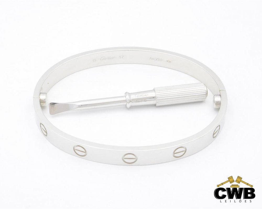 CARTIER – Pulseira Love Ouro Branco 18K Modelo Clássico, Fecho com Parafuso, inclui a chave de fendas, Largura 6.1mm, tamanho 17cm de comprimento, peso de 33 gramas.