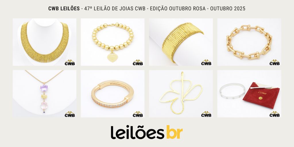 A CWB Leilões fará nos dias 6 e 7 de Outubro, às 19h, o seu 47º Leilão CWB Joias de Luxo, com 302 lotes incríveis com várias joias lindíssimas.