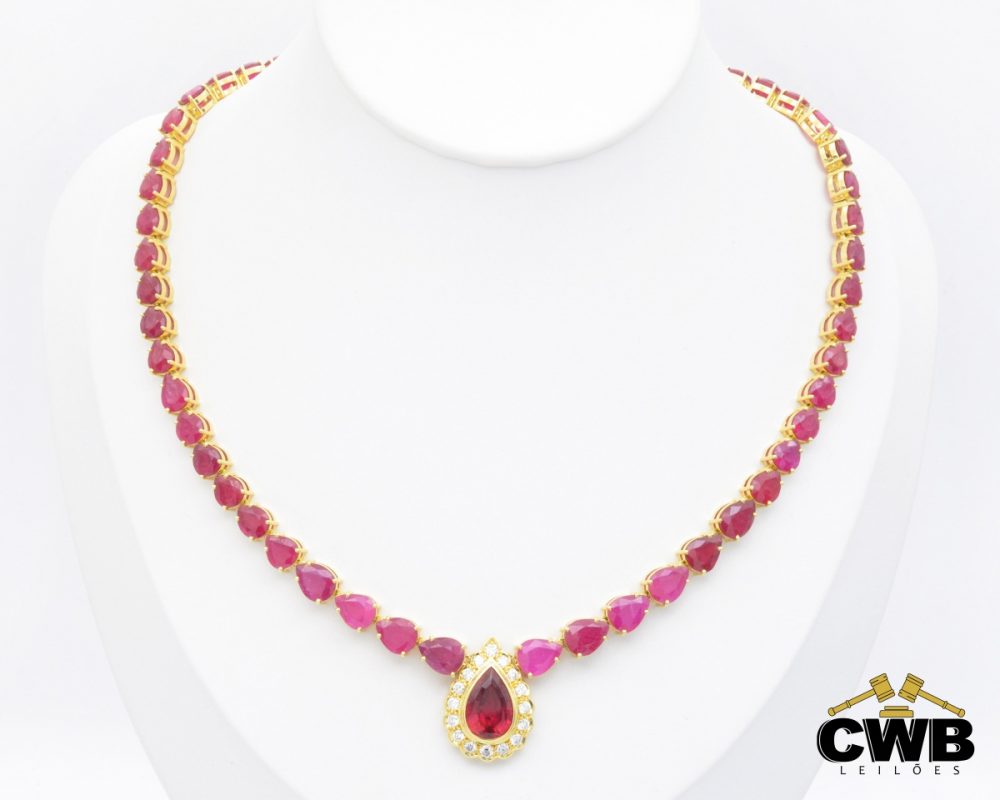 clique aqui para ver o loteCONDIÇÃO ESPECIAL: 5x SEM JUROS: Gargantilha RIVIERA Degrade e Pingente Gota Central em Ouro Amarelo 18K com 53,23 Cts de Rubis, Lapidação Gota e 0,64 Cts de Diamantes, Lapidação: Brilhante, Cor: IJ e Pureza: VS, 41cm de comprimento, peso de 38,3 gramas. Acompanha certificado de garantia CWB LEILÕES.