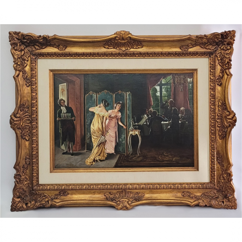 PEDRO WEINGARTNER (1853-1929) CONVERSA ENTRE HOMENS – OST ASSINADO, LOCALIZADO COMO NA CIDADE DE ROMA E DATADO 1918. 71 X 47 CM (SEM CONSIDERAR O TAMANHO DA MOLDURA) COM A BELA MOLDURA TEM 111 X 88 CM. EXTRAORDINÁRIA OBRA RETRATANDO CENA DE INTERIOR EM CASA SENHORIAL COM PERSONAGENS VESTIDOS A MANEIRA DO PERÍODO DIRETÓRIO FRANCÊS. EM UMA SALA ELEGANTE SENTADOS EM TORNO DE UMA MESA ESTÃO VÁRIOS HOMENS CONVERSANDO E BEBENDO ANIMADAMENTE. ATRÁS DE UM BIOMBO FURTIVAMENTE DUAS LINDAS MULHERES OUVEM A CONVERSA E SÃO SURPRIENDIDAS POR UM CRIADO QUE ESTÁ SERVINDO BEBIDAS AO GRUPO.