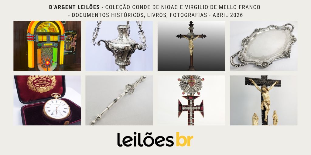 A D’argent Leilões realizará nos dias 28 e 29 de Abril, às 19:30h, o seu Coleção Conde de Nioac e Virgilio da Mello Franco – Documentos Históricos, Livros, Fotografias Confira alguns destaques que separamos especialmente para vocês, clique nas imagens para ir diretamente a peça.