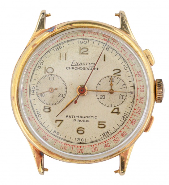 clique aqui para ver o loteEXACTUS – Relógio de pulso chronographe com caixa redonda em ouro rosa . Mostrador prateado com dois submostradores , movimento mecânico .fundo da caixa duplo . botões retangulares ,mostrador assinado , diâmetro 37 mm. com peso ouro 15.1 g e peso bruto 47.3 g