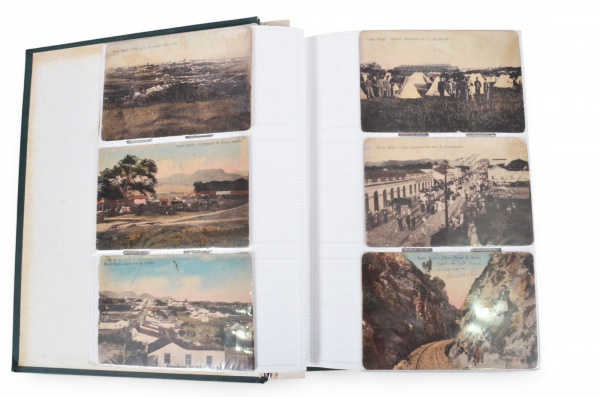 clique aqui para ver o loteCartões Postais (246): SANTA MARIA – RS. Fantástica coleção de cartões postais acondicionados em um álbum com 82 páginas. Circulados nos primeiros anos de 1900 até a década de 1960, em sua maioria. Diversos editores identificados: Papelaria União, Casa A Miscelânia, Stab. Dalle Nogare e Armett (Milano, Itália), Foto Imperial, Foto Postal Colombo, Wessel, Satrap Photo, Carimbo Lanterna Verde, Fotocopia A Bonnet, Livraria do Globo, ColonVist, Estúdio José Artes Fotográficas, Bianchini & Cia, publicitários do Grupo Espírita “Leocádio José Correia” e do Pirajú Hotel, entre outros, alguns não assinados.