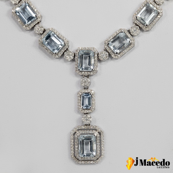 clique aqui para ver o loteColar Ouro Branco 18k com Diamantes de 6,7 cts total, Letra: J, Pureza: S1 – Lapidação Brilhante – e Águas Marinhas de 21,95 cts total. Descrito no fecho da peça. Medida 45cm. Peso 49,4.