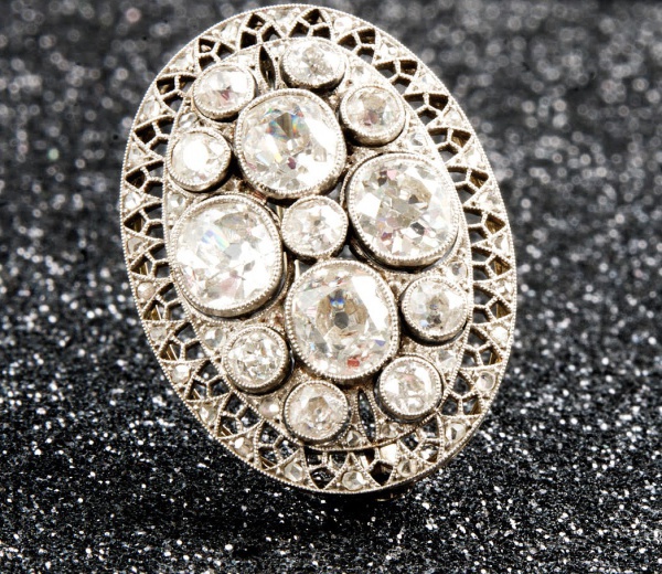 JÓIA CIRCA 1910 ,ESPECIAL PELO SEU ACABAMENTO.O CONJUNTO ATINGE UM EQUILÍBRIO ESTÉTICO EXCEPCIONAL.FINÍSSIMA PLACA BROCHE ART DÉCO ENGARCE MILLE GRAIN EM PLATINA COM APROX 5,70 QUILATES TOTAL DE DIAMANTES.
