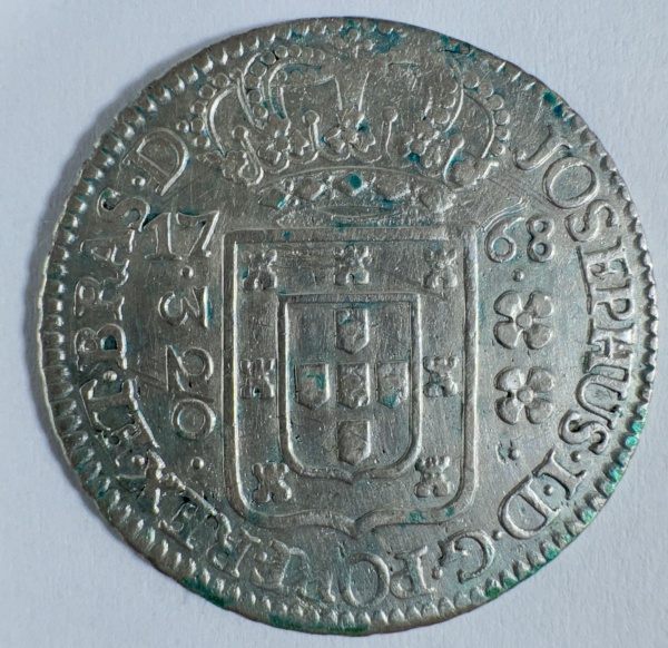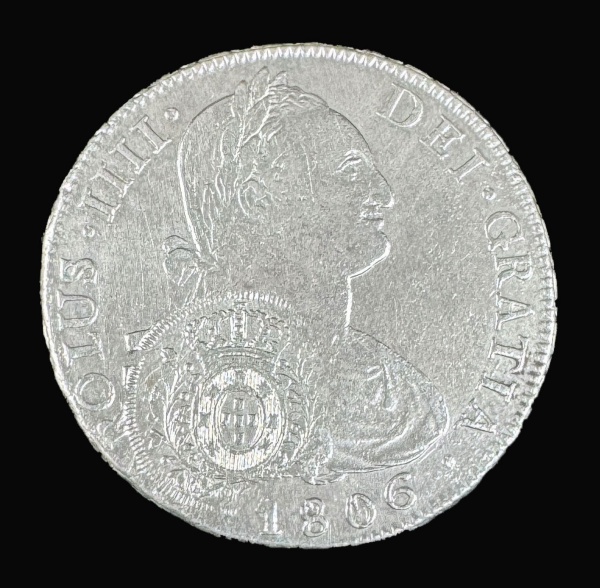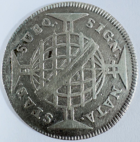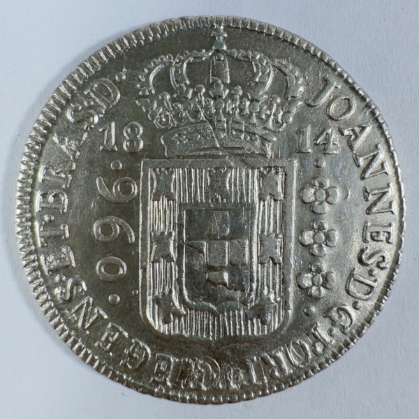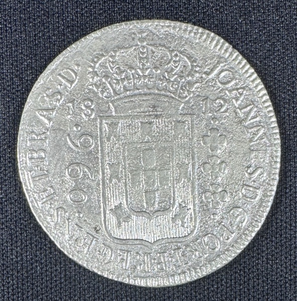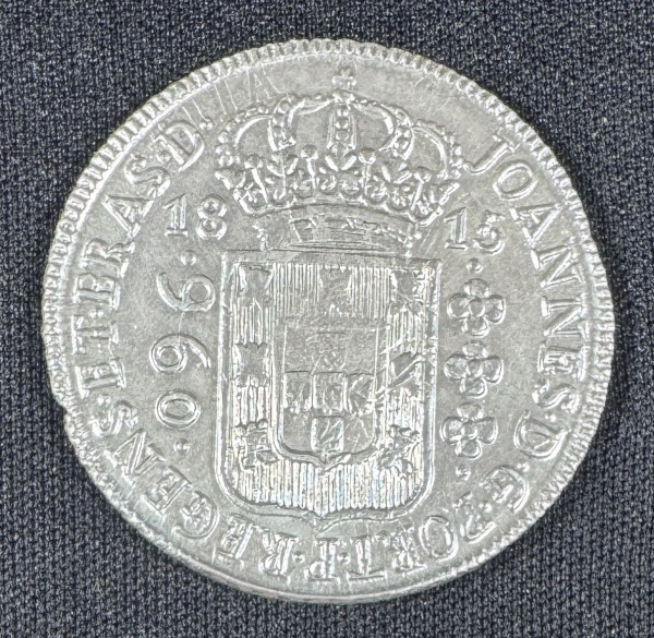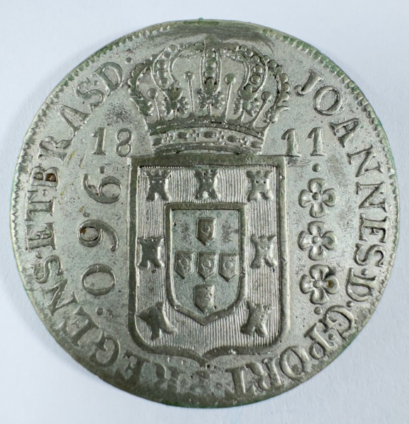 Antiga moeda de 960 réis em prata, Brasil, 1811. Diam. 3.9 cm. Peso: 25.8 gramas.