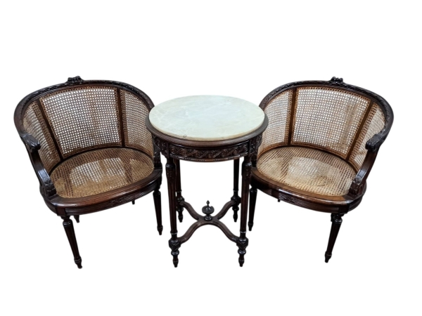 clique aqui para ver o lotePar de cadeiras com encosto e assento de palhinha e mesa com tampo de mármore, de madeira nobre ricamente entalhadas, mesa medindo 78cm de altura e 54cm de diâmetro e cadeiras medindo 84cm x 62cm x 53cm, mesa com bicados no mármore, uma das cadeira precis