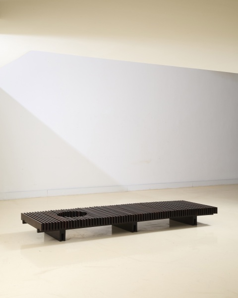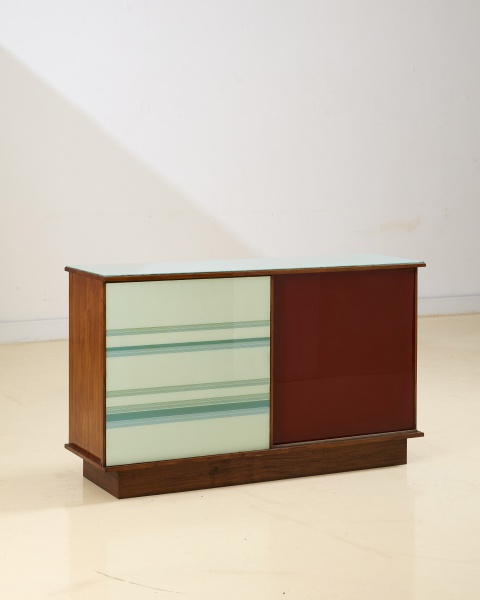 clique aqui para ver o loteAbraham Palatnik (Arte Viva) – Aparador executado em perobinha do campo com portas e tampo em vidro pintado com tinta sintética friável. Brasil, ca. 1955. Dimensões: 90(H) x 150(L) x 49(P) cm.