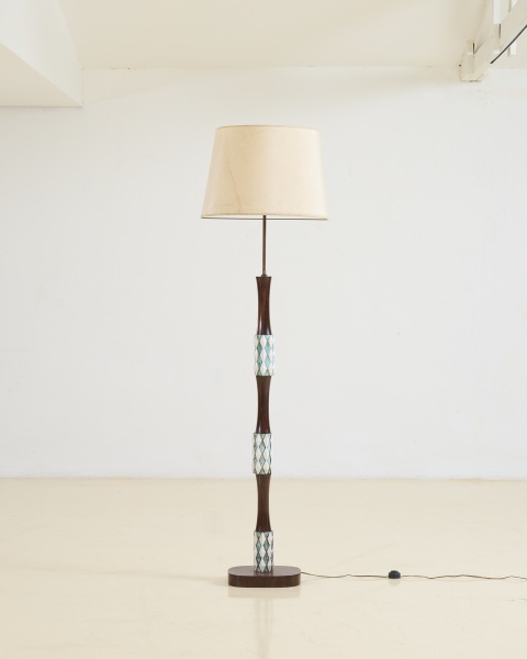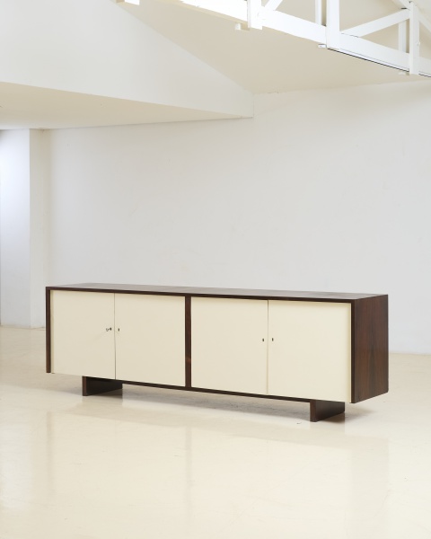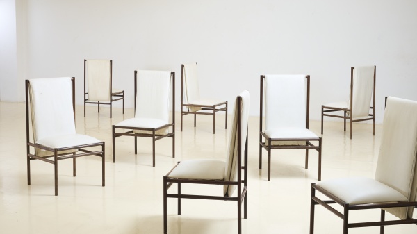clique aqui para ver o loteJoaquim Tenreiro (Tenreiro Móveis e Decorações) – Conjunto de oito raríssimas cadeiras executadas em jacarandá maciço com sessão cilíndrica, assentos e encostos revestidos em manta de couro branco. Brasil, déc. 1960. Dimensões: 98(H) x 51,5(L) x 54(P) cm.