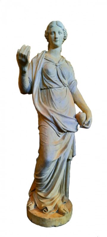 ELEANOR COADE – (3 de junho de 1733 – 16 de novembro de 1821) foi uma empresária britânica conhecida por fabricar estátuas neoclássicas , decorações arquitetônicas e ornamentos de jardim feitos de pedra Lithodipyra ou Coade por mais de 50 anos, de 1769 até sua morte. Ela não deve ser confundida ou confundida com sua mãe, também chamada Eleanor. Obs : A mão do braço direto foi restaurada .Med. 1,56 metro. Base 36 cm de Diâmetro peso aproximadamente 130 kgs. Está peça só poderá ser transportada por transportadora especializada .