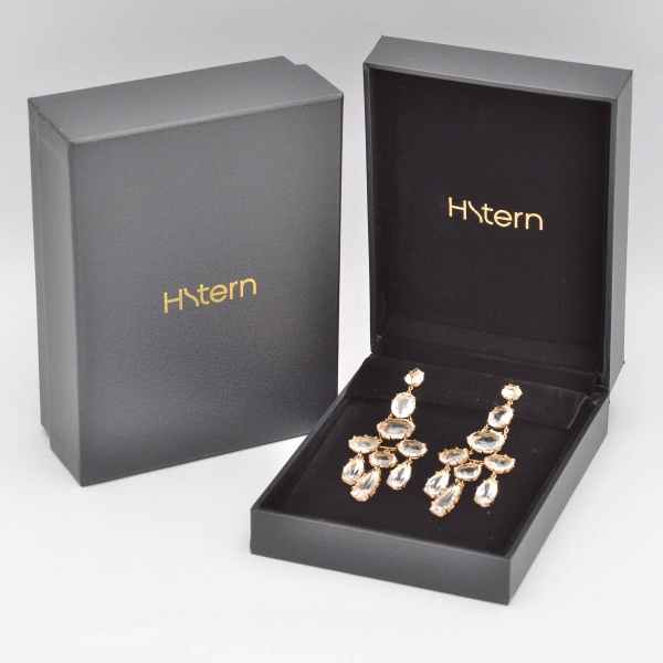 clique aqui para ver o loteH STERN. Par de brincos em ouro amarelo, 18 k, e cristal de rocha lapidado em diferentes formatos e tamanhos, modelo B2CR160733, No estojo original. Comprimento 7 cm.