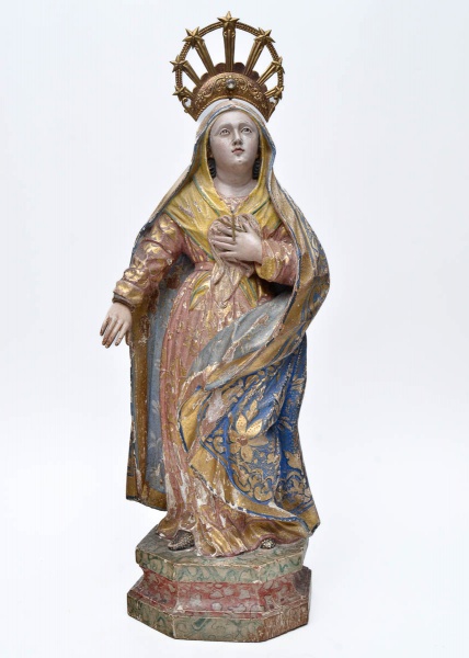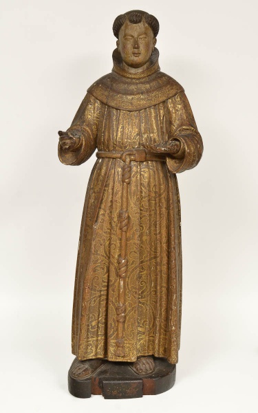 clique aqui para ver o loteSANTO ANTONIO DE LISBOA (ou de PÁDUA) – Importante e rara imagem de Santo, em bloco maciço de madeira, sobre base também de madeira, do século XVII, conforme laudo de avaliação firmado pela Restauradora-Conservadora portuguesa MARTA BRETÃO, hábito da Ordem dos Franciscanos, com rica douração a folha de ouro e decoração representando os tecidos brocados da época.