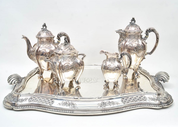 clique aqui para ver o loteAparelho de chá e café, com 5 peças, de PRATA FRANCESA, contraste CABEÇA DE MINERVA, primeiro título, teor 950. Século XIX. Peso líquido, 4805 gramas. Bule para chá, bule para café, leiteira, açucareiro e bandeja. Alças do bule com isoladores de marfim. Trabalho com motivos fitomorfos e treliças.