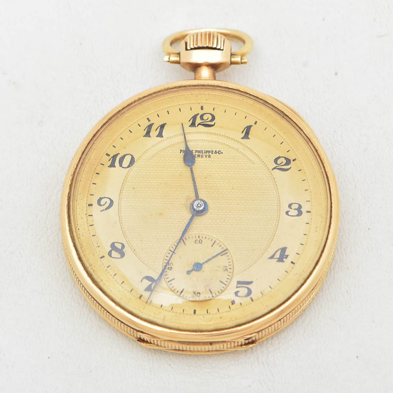 PATEK PHILIPPE GENEVE – Relógio de bolso suíço, 20 linhas, modelo Jacket. Caixa redonda de OURO AMARELO 18K, teor 750, medindo 49 mm. Mostrador com ponteiros e algarismos arábicos em preto, sobre fundo amarelo. Com segundeiro. Movido a corda. Apresenta numeração 204184, contraste do ouro com CABEÇA DE HELVETIA. Dedicatória com inscrição “Ch D. Maeder Du Bois Rio de Janeiro”. Apresenta outra numeração 81295 e inscrição Montre de Patek. Philippe & C Geneve.