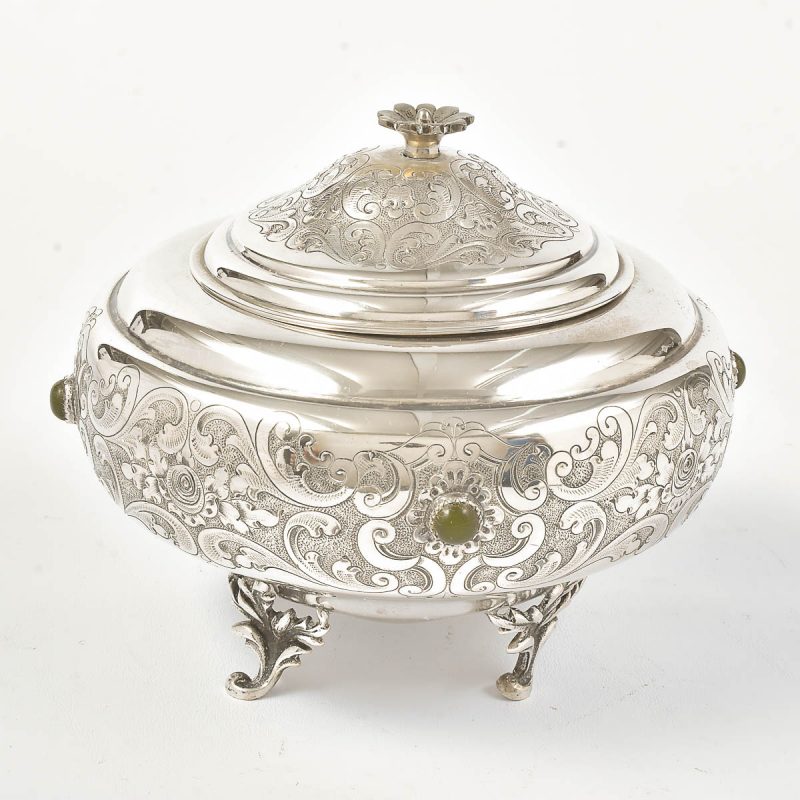 Bomboniere de PRATA. Peso 580 gramas. Marcado no fundo “1 Título” e contraste não identificado por desgastes. 4 pés no feitio de folha. Bojo formato de pastilha. Pega da tampa no feitio de flor. Peça lavrada com motivo de folha de acanto. Aplicação com pedras verde. Altura 14 cm e diâmetro 16 cm.