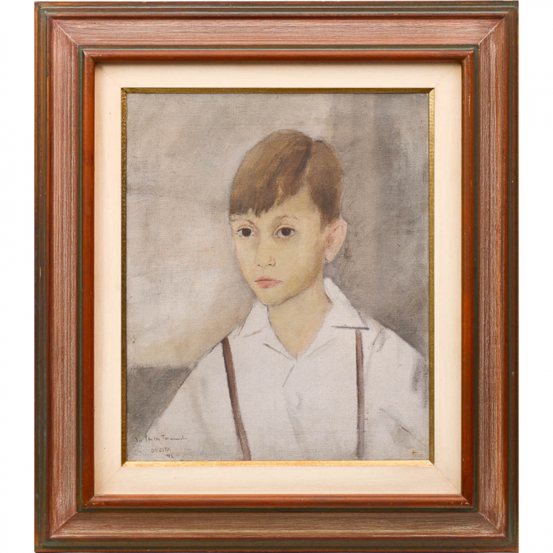 MILTON DACOSTA (Niterói RJ 1915 – Rio de Janeiro RJ 1988) – “Retrato de CARLOS FERNANDO”. Óleo sobre tela, 46 x 37 cm. Assinado, titulado e datado no canto inferior esquerdo, 1942. No verso, inscrição posterior, “Este quadro pertence a Fernando Almeida em 18 – XII -62”, rasurado. Moldura de madeira, 68,5 x 60,5 cm.