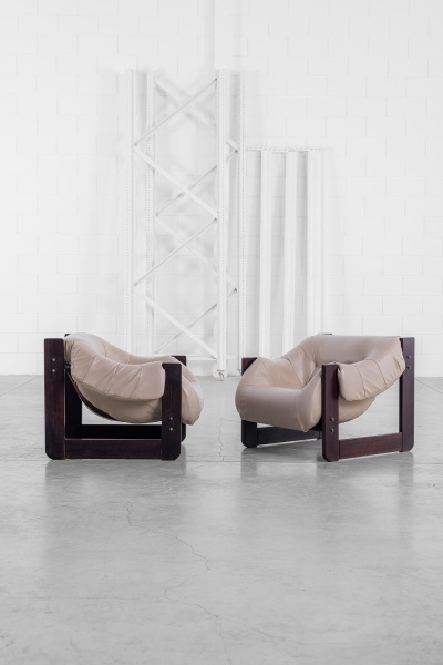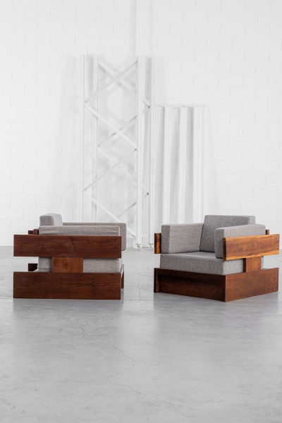 clique aqui para ver o loteJoaquim Tenreiro- 1960- Par de poltronas Curva. Assento concha estruturado em madeira nobre com estofamento forrado em tecido. Ambas em perfeito estado. Já restauradas. 84x80x65cm de altura.