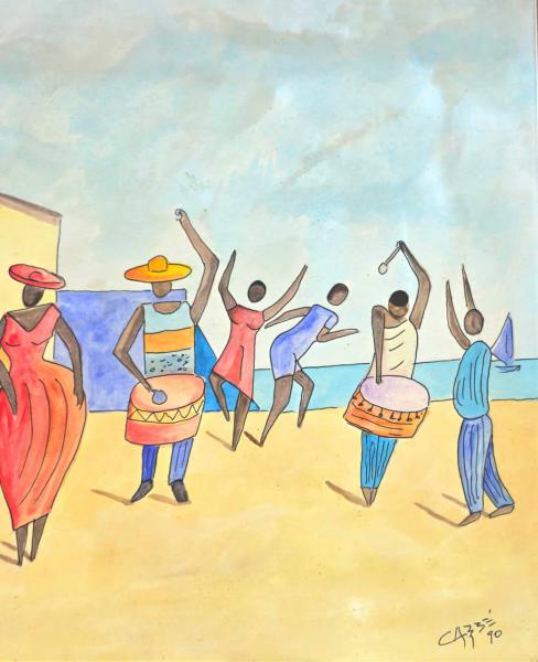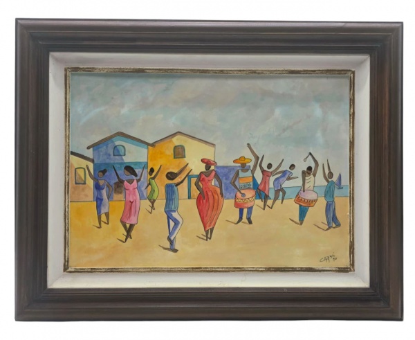 clique aqui para ver o loteCARYBÉ (1911-1997) – Festa à beira mar; tamanho: 49 x 34 cm; técnica: vinil encerado sobre cartão colado em eucatex; assinado, CID; ano 1990. Medida com moldura: 67 x 52 cm.