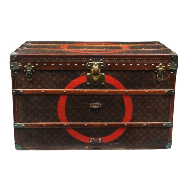 LOUIS VUITTON – Raríssimo baú de viagem em madeira revestida em couro monogramado ` LV ` e personalizado. França, c. 1900–1920. Importante baú de viagem Louis Vuitton, com ferragens originais em latão, fecho central gravado Louis Vuitton, Paris – London, cantoneiras em metal e guarnições em couro.