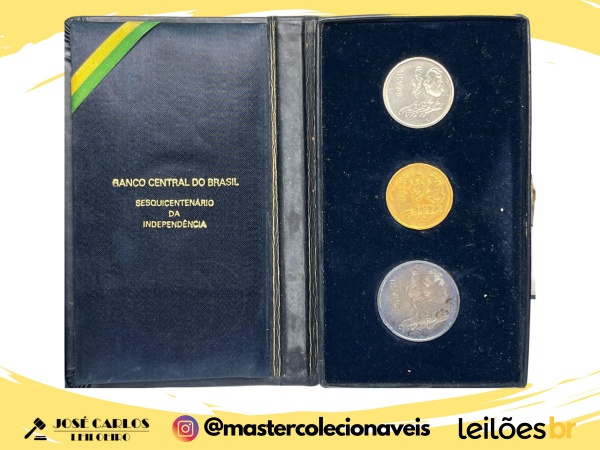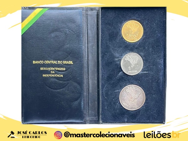 clique aqui para ver o loteMoeda do Brasil – Estojo Original Comemorativo Sesquicentenário da Independência – 1972 – 300 Cruzeiros de OURO (.920) com 16,65 gramas, 20 cruzeiros de prata e 1 cruzeiro de Níquel – (3 moedas) – Incluindo caixa vermelha de papelão ! Cat. AI O738 + P724 + V324 – id 9002 – id 9003 – Desgaste em todos os lados da Luva Externa conforme fotos na tela 5