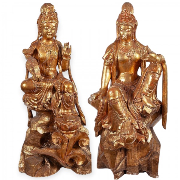 clique aqui para ver o lotePar de espetaculares esculturas de Guanyin em madeira entalhada e folheada a ouro. Representando a deusa da compaixão sentada sobre bases rochosas em dois diferentes mudras de meditação.