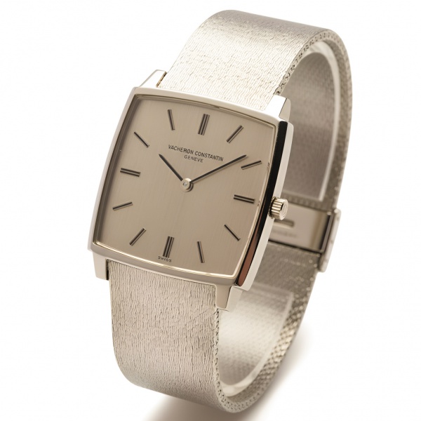 clique aqui para ver o loteVacheron Constantin Genève Relógio em ouro branco 18K, caixa retangular e mostrador prateado com marcadores aplicados. Pulseira metálica texturizada. Peso total 64,87 g.