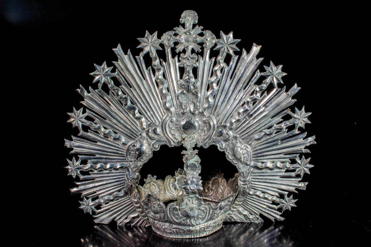 Elegante e grandiosa “coroa resplendor” em prata . Contraste “V. Gargallo”. Século XIX. 29 x 25 cm. Peso: 235 g.