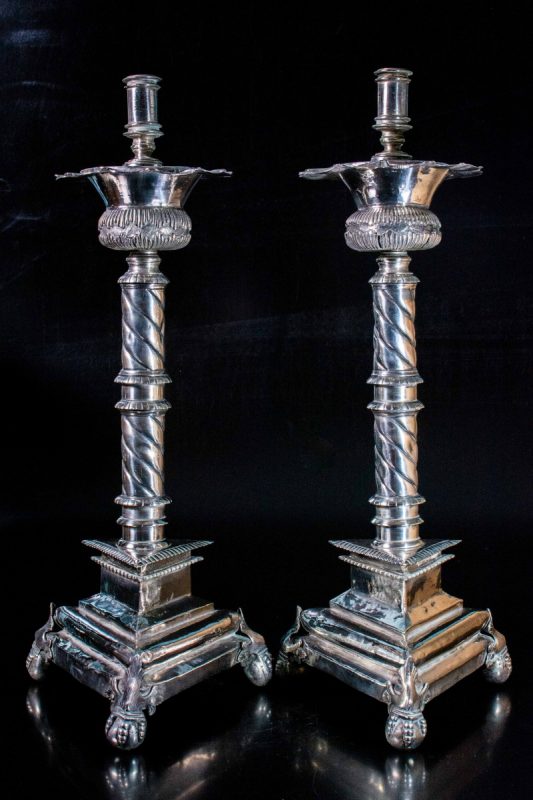Século XVII. Par de muito raros tocheiros de prata. Queimadores, sobre bobeches circulares lavradas, que encimam colunas torcidas sustentadas sobre bases tripoides, molduradas em escada, sobre pés de garra sobre bolas. América do Sul. Séc. XVII. 53 cm. Peso: 3.520 g.