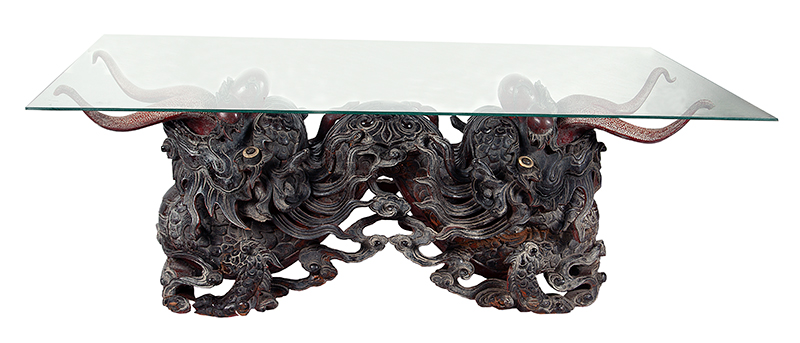 Excepcional escultura oriental utilizada como base de mesa de centro. Corpo com exótica e excepcional iconografia zoomórfica de expressivo imaginário. Origem e datações não precisados, mas certamente um exemplar oriental de extensa antiguidade. Escultura 100 x 43 x 60 cm. Coleção Luiz de Abreu Pereira.