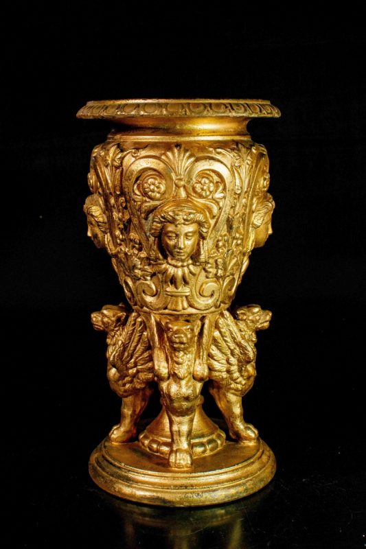 Bohêmia. Excepcional e raro vaso art nouveau executado em terracota com patina dourada. Bojo ornamentado com cabeça de baco e folhagens de videiras, sustentado por quatro esfinges acima de bases circulares. Século XIX. Assinado JM com o símbolo Ústí nad Labem e numerado no fundo. Localizado Tchecoslováquia, marca correspondente ao período entre 1863 e 1890. 33 x 18 cm.