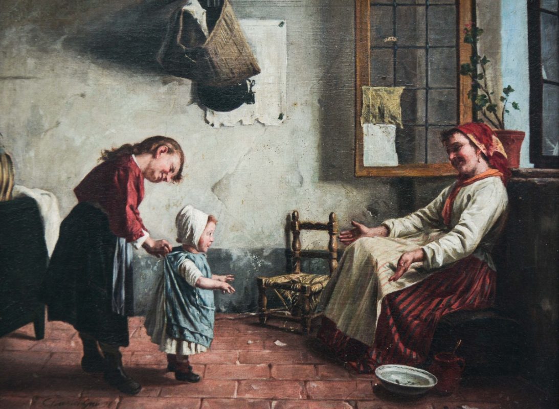 Gaetano Chierici (Régio da Emília, Itália. 1838 – 1920). “I Primi Passi”. Óleo s/tela. 30 x 40 cm. Assinado. Moldurado.